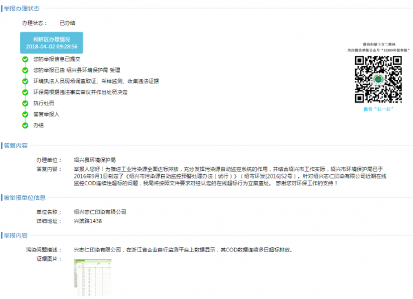 2018.03.29 在浙江省企业自行监测信息公开平台“绍兴志仁印染有限公司”连续多日超标排放 化学需氧量 污染物,绿色江南通过12369及微博向当地环保局提示该情况,详见下图: