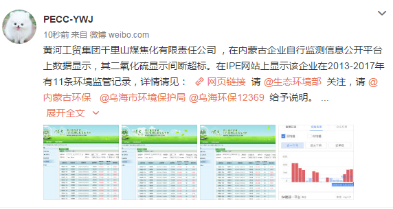 2018.04.19 在内蒙古自治区重点监控企业自行监测信息发布平台“黄河工贸集团千里山煤焦化有限责任公司”间断性超标排放 二氧化硫 污染物,绿色江南通过12369及微博向当地环保局提示该情况,详见下图: